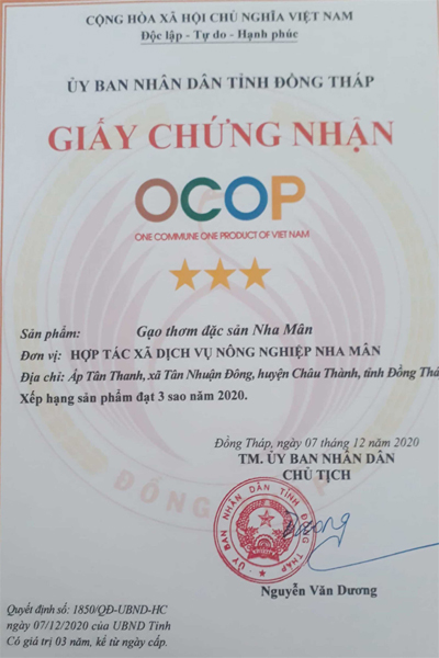 Để mang lại hiệu quả kinh tế và nâng cao giá trị hạt gạo, HTX Nha Mân xây dựng thương hiệu “Gạo thơm đặc sản Nha Mân” cung ứng cho thị trường. Để đảm bảo chất lượng, trước khi thu hoạch, HTX cử cán bộ đến lấy mẫu thử để kiểm tra tồn dư thuốc bảo vệ thực vật trên lúa. Sau đó, lúa sẽ được mang đi xay xát, sơ chế, đóng gói và hút chân không. Mỗi sản phẩm đều được dán nhãn “Gạo thơm đặc sản Nha Mân” cùng với mã code để người tiêu dùng có thể truy xuất nguồn gốc.
